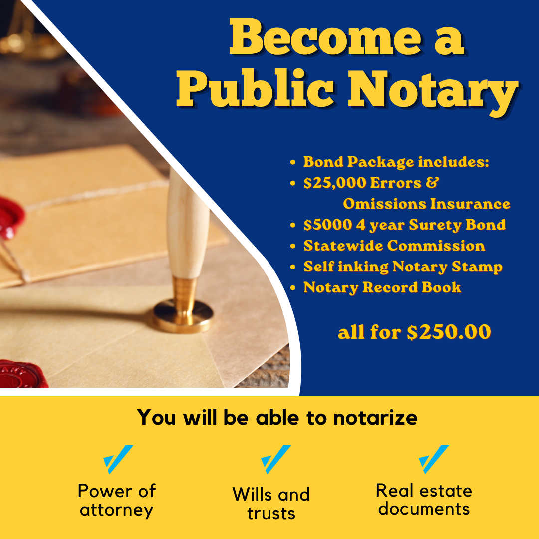 Notary Surety Bond,Statewide Commission, Errors & Omissions Insurance with Self-inking Notary Stamp is $250.00.